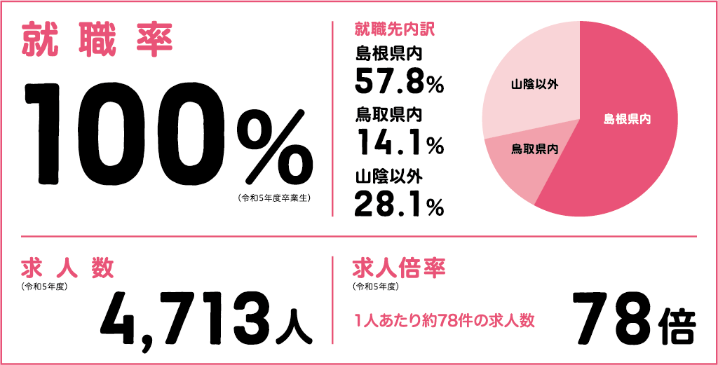 島根・鳥取での就職率が高いのも当校の特徴です。規模の大きな急性期病院や慢性期病院、地域のクリニックまで就職先は多種多様。実習先に就職するケースも多く、卒業生がいる施設で働ける安心感も。