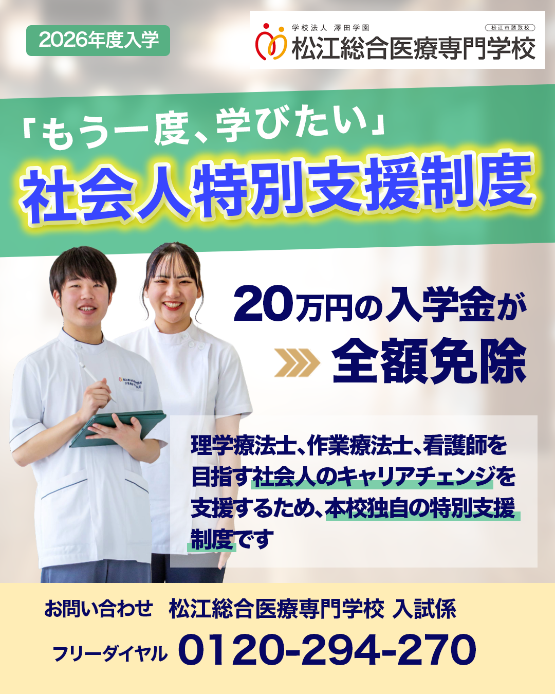 入学金が免除される「社会人特別支援制度」を設けました