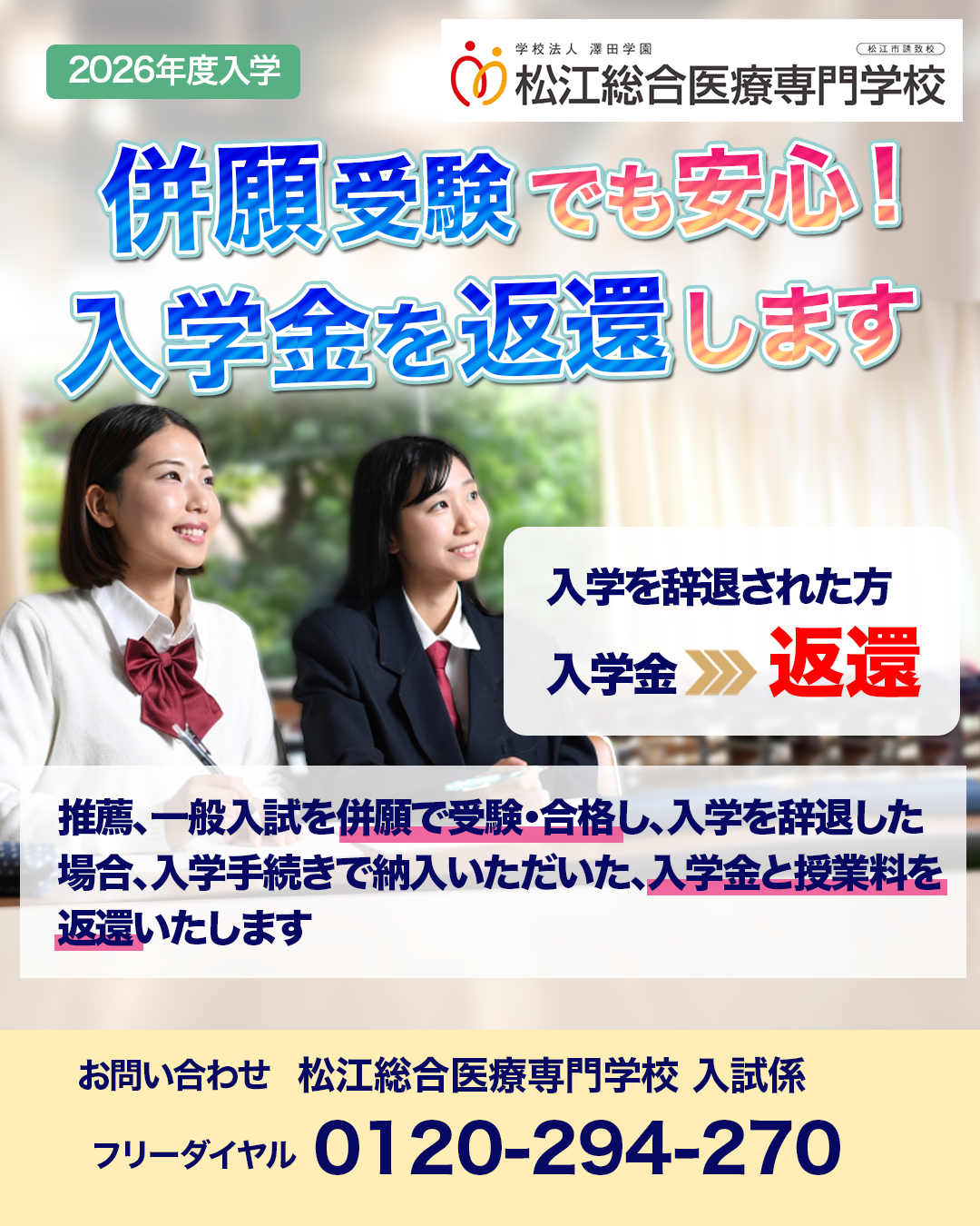 【入試情報】推薦・一般入学試験 併願受験者への入学金返還