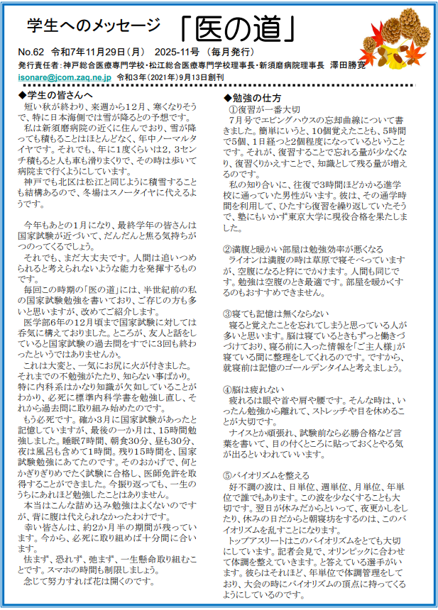 2025年11月29日 理事長メッセージ 「医の道」発行のお知らせ 「医の道」(令和7年11月号)を発行しました。 澤田理事長から医療を志す皆さんへ心を込めてメッセージを配信しています! 今回のテーマは、「勉強の仕方」についてです。 ぜひご一読ください。 記事一覧へ