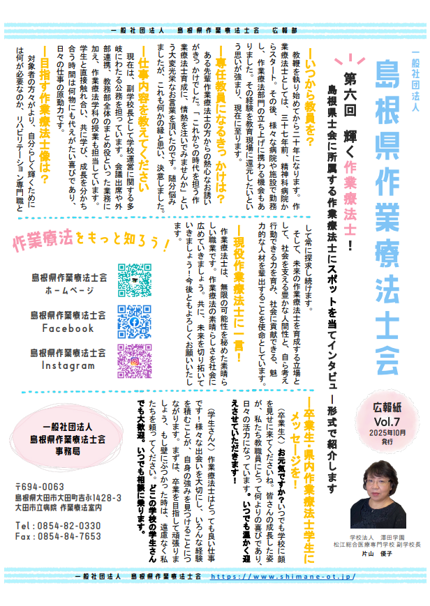 このたび、本校の片山 優子副学校長が、島根県作業療法士会の広報誌にて紹介されました。