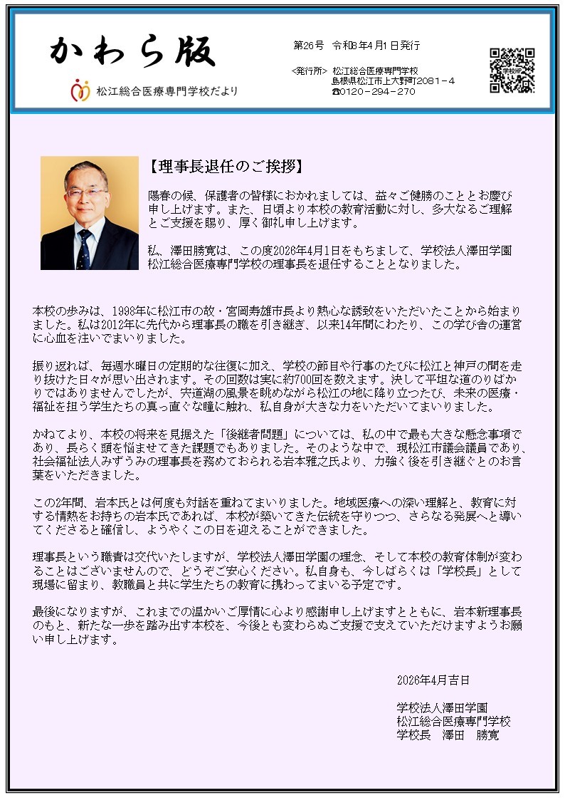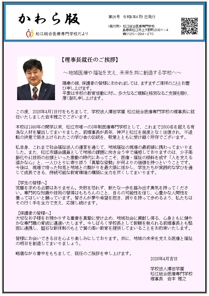 2026年04月01日 学校便り かわら版 (松江総合医療専門学校だより)第26号発行のお知らせ 本校のことをよく知っていただくために、月に一度「かわら版(松江総合医療専門学校だより)」を発行しています。 第26号を発行しました。 ぜひご覧ください! 記事一覧へ